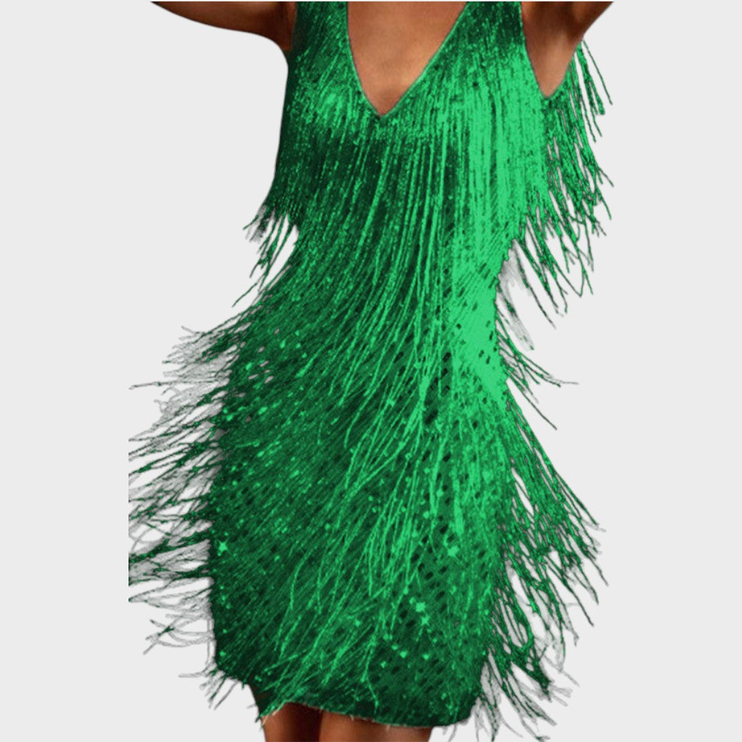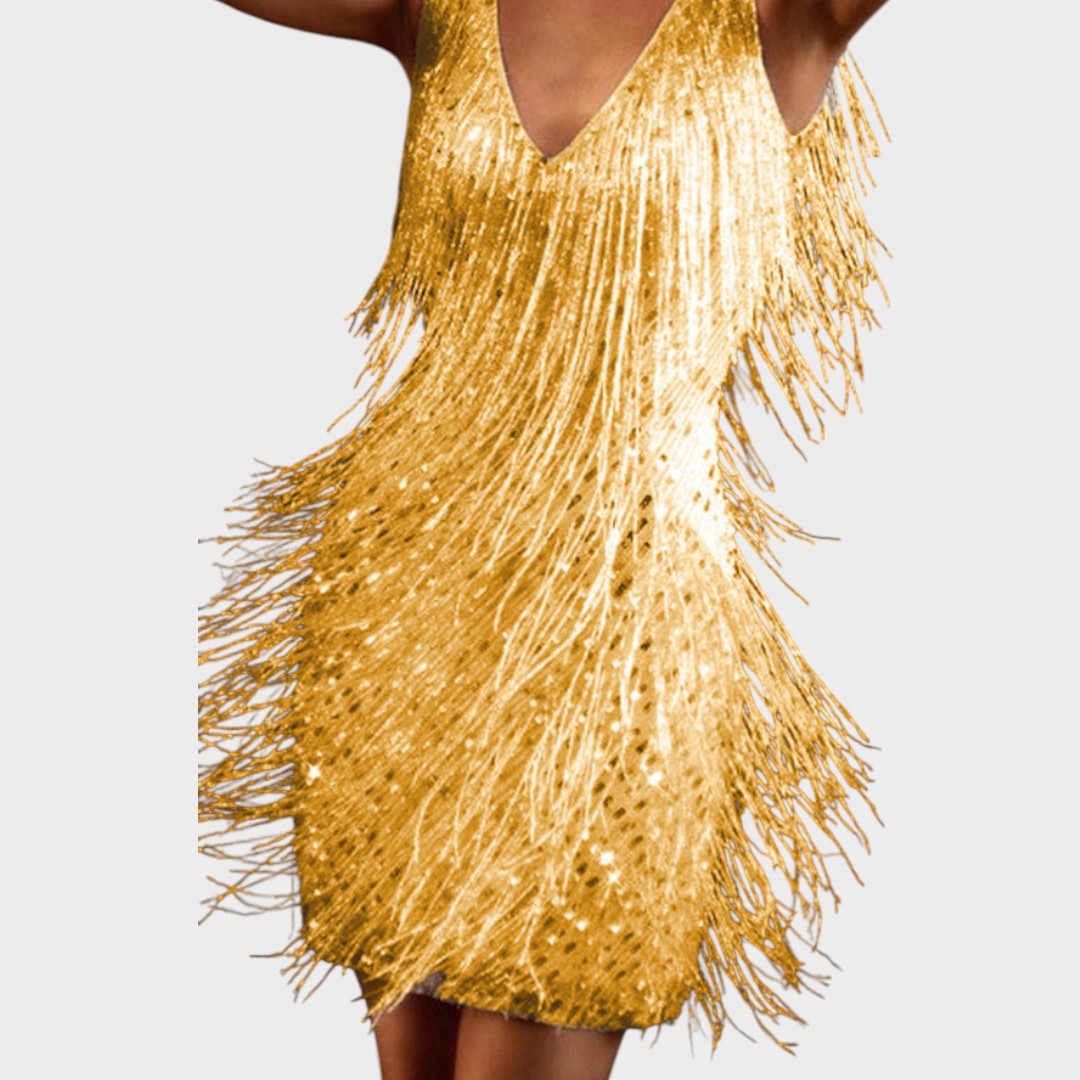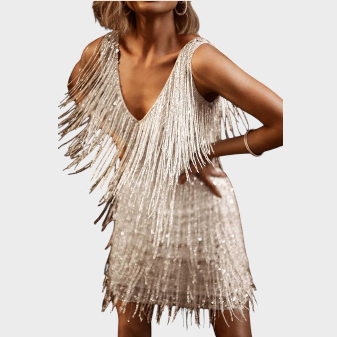 Obleka Tasa je popolna izbira za vse, ki želijo zasijati na posebnih dogodkih. Z bleščečimi franjami, ki se premikajo z vami, in elegantnim V-izrezom, ta obleka prinaša sofisticiranost in glamur na vaše praznične večerje.