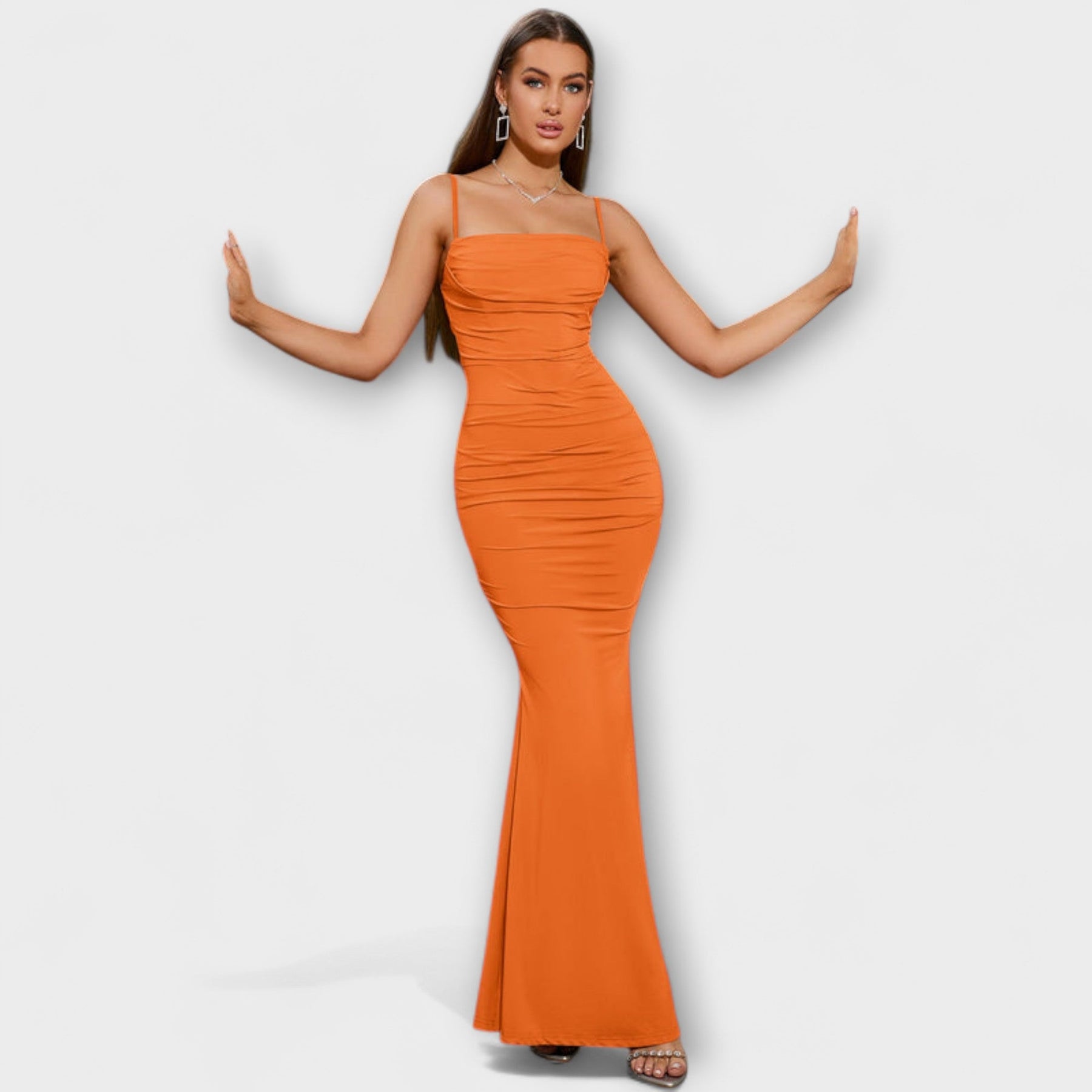 Predstavljamo vam naše osupljive obleke z razkritim hrbtom in maxi dolžino, idealne za to, da naredite vtis na katerem koli dogodku. Te obleke imajo elegantni enobarvni vzorec in obliko morske deklice, ki poudari vašo silhueto.
